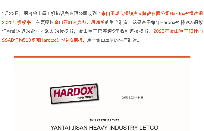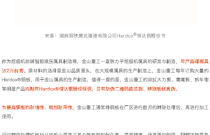 金山重工連續五年受(shòu)瑞典鋼鐵奧克隆德有限(xiàn)公司Hardox®悍達(dá)鋼授權